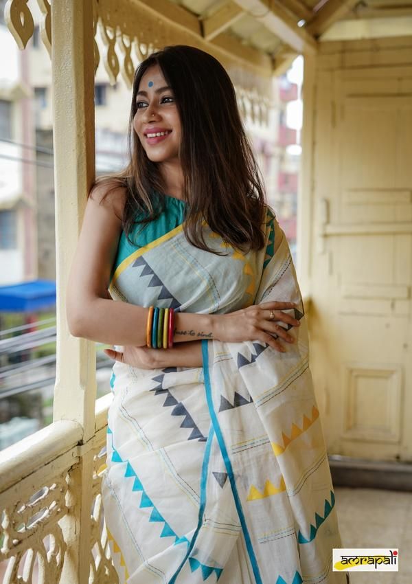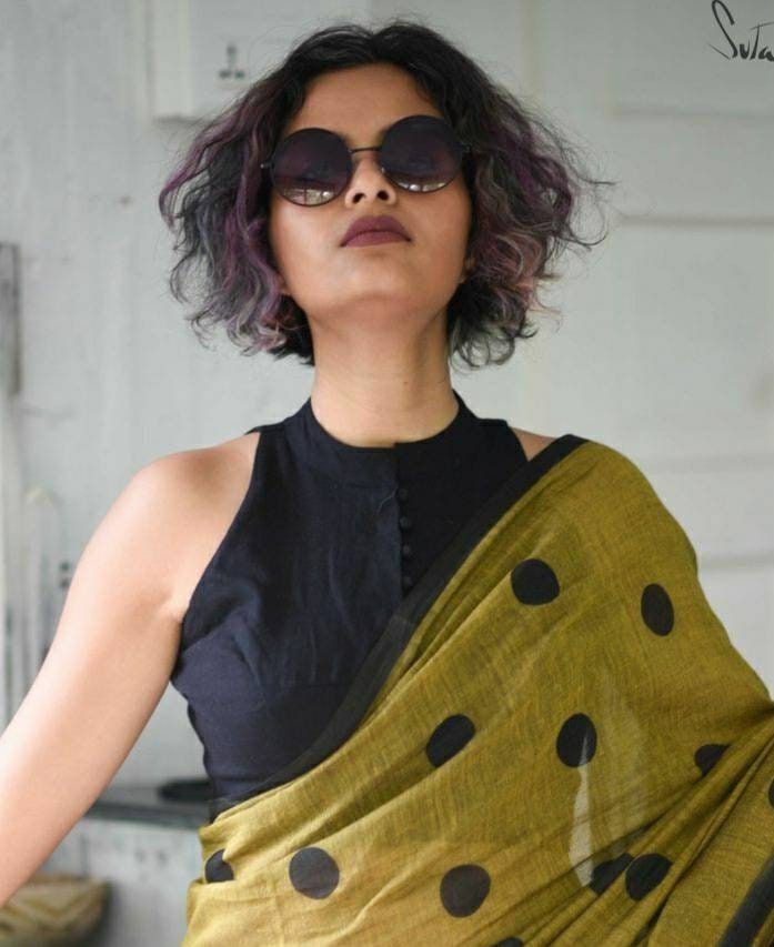 The collar’s structured design adds an elegant look, making it the perfect choice for formal occasions or office dress. Half-buttoned and button-down styles are also possible for a sleeker look. This makes it a stylish and versatile accessory to your linen saree wardrobe. A multi-layered necklace and a collar-line blouse can further enhance the look.