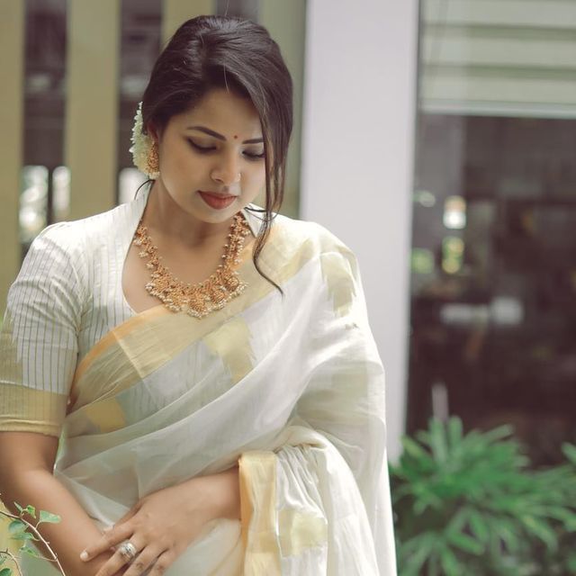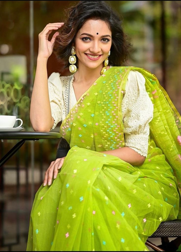For an easy and stylish look, wear a simple but elegant cotton blouse with a dark saree, which includes delicate needlework.