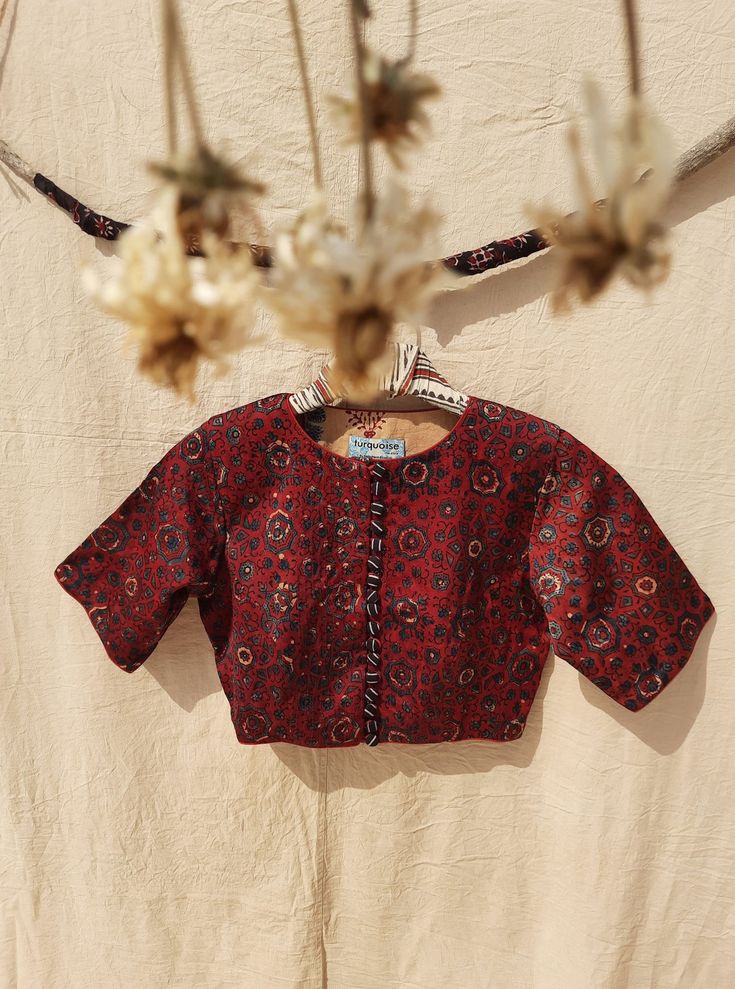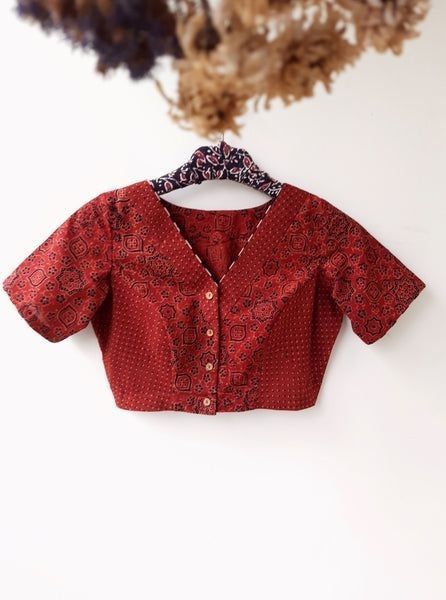Contemporary accents such as ruffles, ornaments, or lace can be found on fashionable cotton saree blouse styles, adding an elegant look to a red blouse perfect for formal or festive wear.